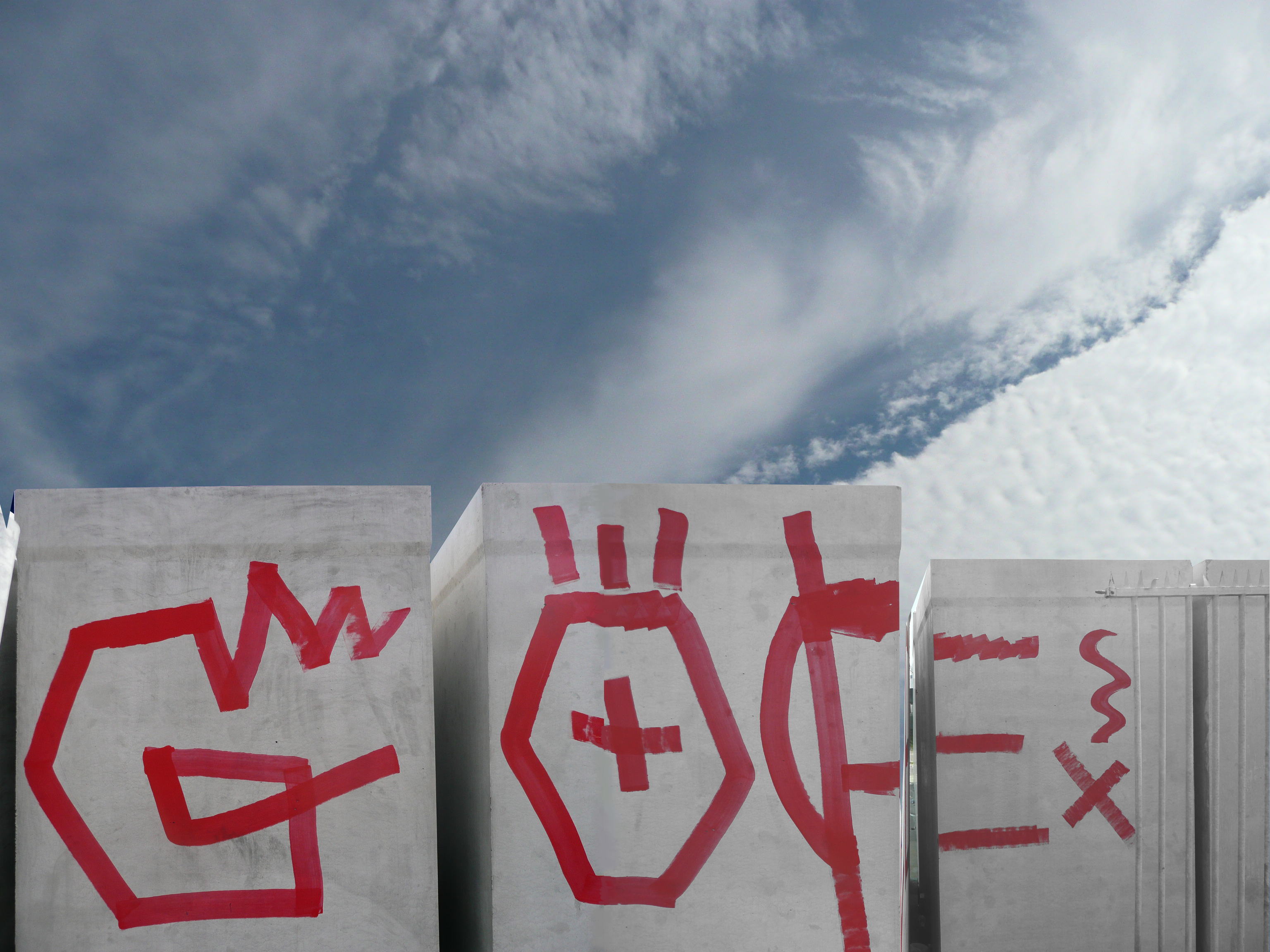 Ik loop zwijgend naar een paar betonblokken, waar zojuist wat foto’s van zijn genomen en wijs naar een tekst, gespoten op drie gigantische blokken beton en doneer hem hartelijk mijn visitekaart.
