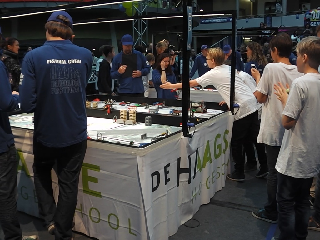 Ik raak aan de praat met een enthousiaste ouder uit Zoeterwoude. Hij praat mij bij over wat er allemaal gebeurt. Zijn zoontje doet mee aan het Zoeterwoude team en corrigeert hem een enkele keer. Deelnemers aan deze regionale wedstrijd dingen mee naar de Europese finale in Noorwegen. Deze vader weet er zoveel van omdat zijn broer in Denemarken woont en daar zijn zoontje ook laat meedoen. Dus de twee neefjes zouden, als het meezit, elkaars landelijke rivalen kunnen worden naar de eindstrijd in Amerika! De finale van FIRST (For Inspiration and Recognition of Science and Technology) heeft al eens in Hawaï plaatsgevonden, vertelt de vader enthousiast. En dat enthousiasme deel ik graag met hem.
