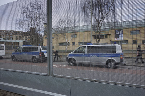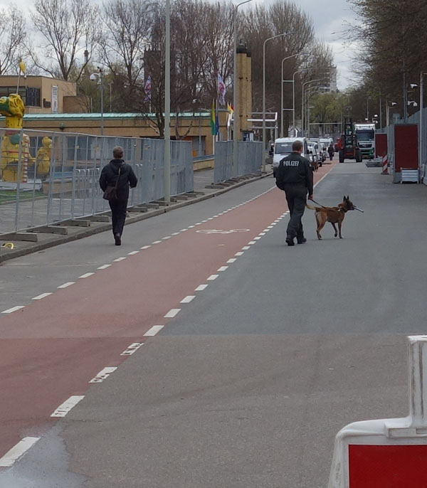 Bij inspectie van het gebied waar het NSS gaat plaatsvinden zag ik een persoon met Polizei op zijn rug rondwandelen. Ik maakte een fotootje van de persoon door een spleet in het meer dan manshoge hek. “Wat is dat nu weer?” dacht ik en ging verder op onderzoek uit en kwam zo uit bij de Blaf Mercedessen, waaruit bleek dat er meerdere honden met baasjes van de Duitse Polizei zijn ingeleend.
