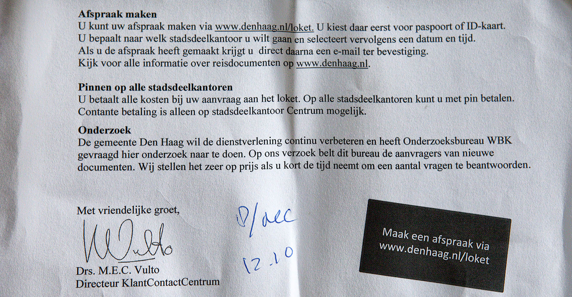 De gemeente Den Haag wil de dienstverlening continu verbeteren en heeft Onderzoeksbureau WBK gevraagd hier onderzoek naar te doen. Op ons verzoek belt dit bureau de aanvragers van nieuwe documenten. Wij stellen het zeer op prijs als u kort de tijd neemt om een aantal vragen te beantwoorden.