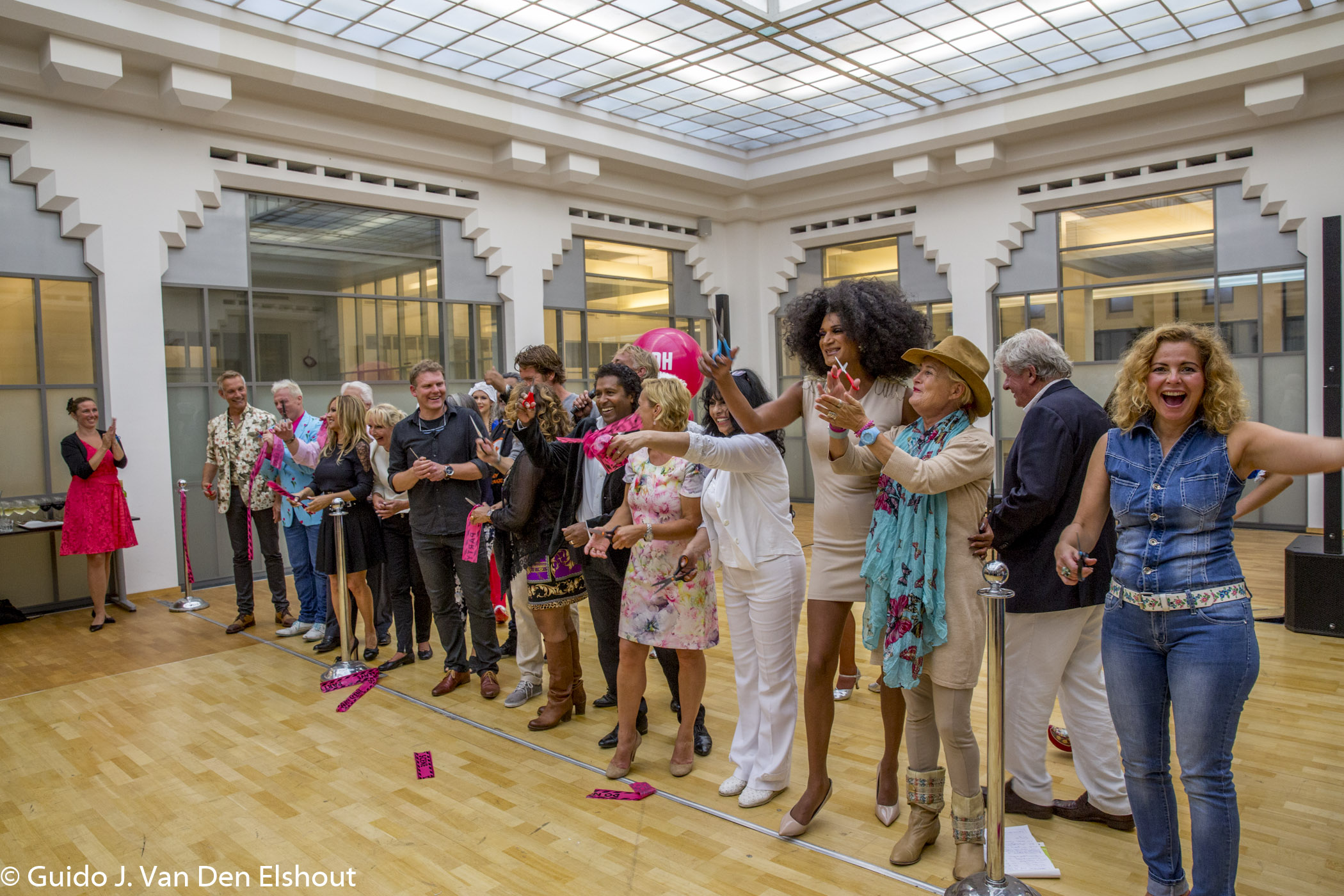 Na de verrassingsvaart verzamelde iedereen zich op de eerste verdieping van het Berlagegebouw. Daar werd na een paar toespraken – Iets daarvan heb ik op video en zal ik later toevoegen – op originele wijze door 16 mensen tegelijk een lint doorgeknipt.