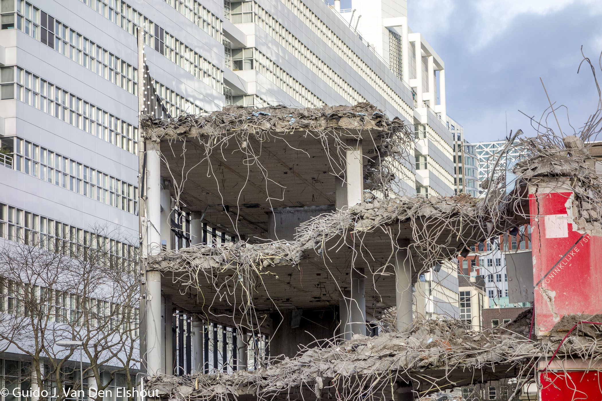 2. Ik vroeg de mijnheer externe betrekkingen van Jan Knijnenburg, de sloper, hoe dat zat. Ik zei:”Jullie gaan echt snel, moet een makkie zijn zo’n tijdelijk gebouw…. ” waarop hij antwoordde: “Helemaal niet. Het zit prima in elkaar, kijk maar, we krijgen de pilaren maar heel moeizaam weg en de vloeren zijn ouderwetse gegoten vloeren. Niet kapot te krijgen. Ook de gevel zat heel goed bevestigd. Dat maken wij wel anders mee. Dan duwen we ertegen en valt het om.” Tot zover dus over dat tijdelijke uit de mond van de expert.