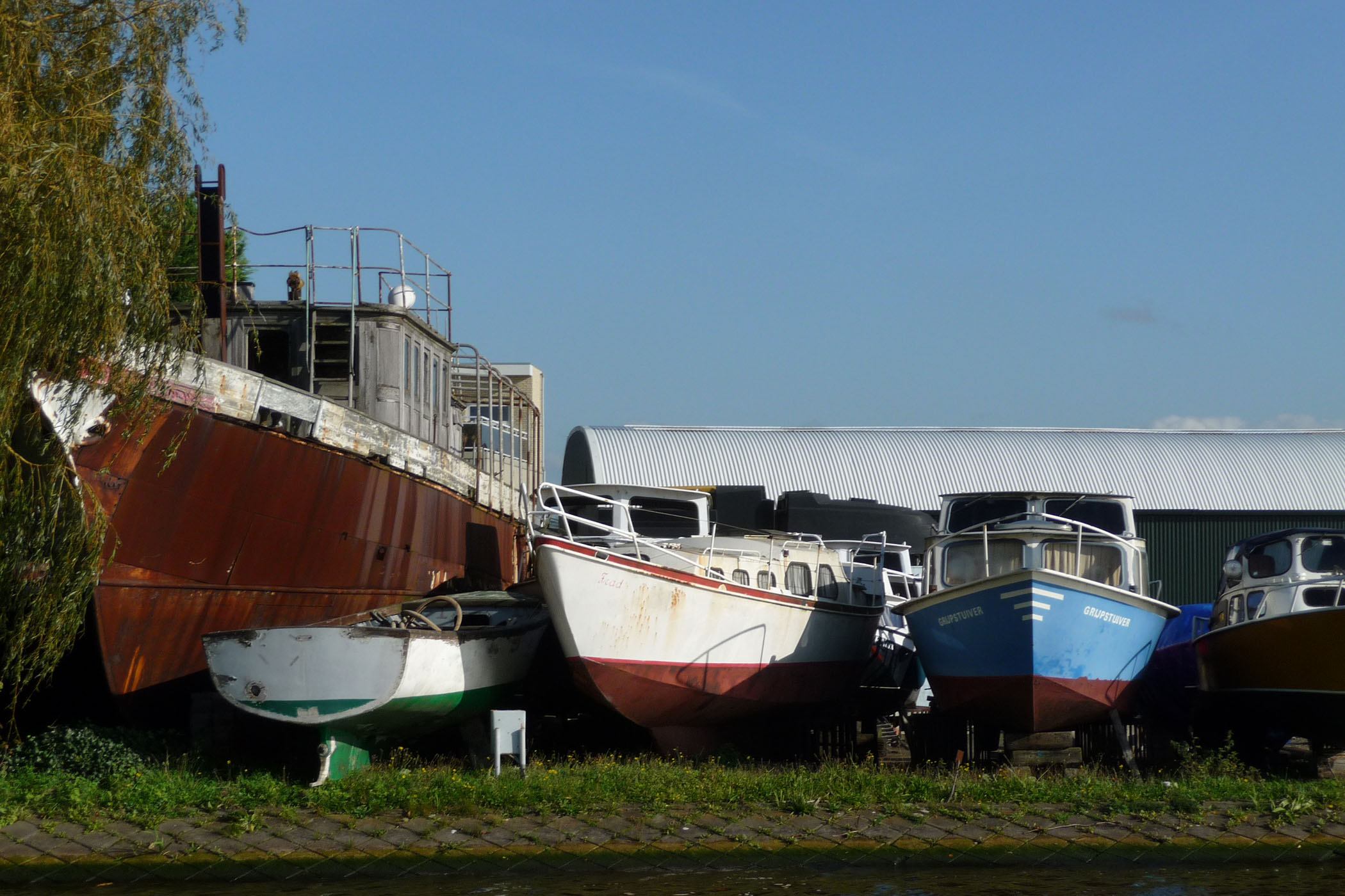 Het is een beetje triest verhaal. Op de foto aan de linkerzijde ziet u de roestige romp van een schip dat ooit een klipperboeg had. Er stak toe ie nog springlevend was nog een boegspriet uit. Landlubbers zouden het een stokkie noemen. Volgens mij is dit het restant van de “Sparkle” ooit een prachtige motorboot, eigendom van een antiquair die het volgestopt had met antiek als varende showroom.