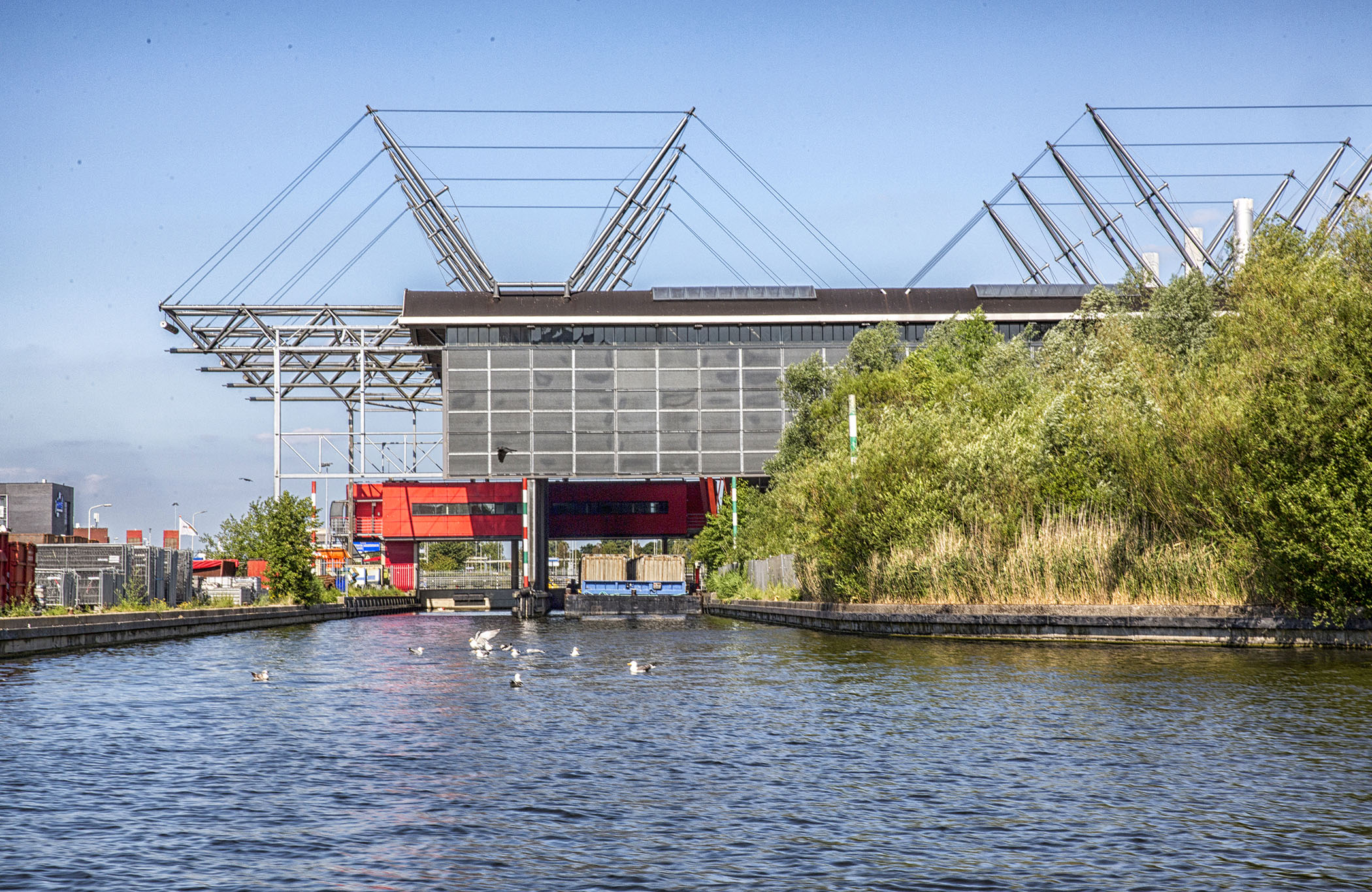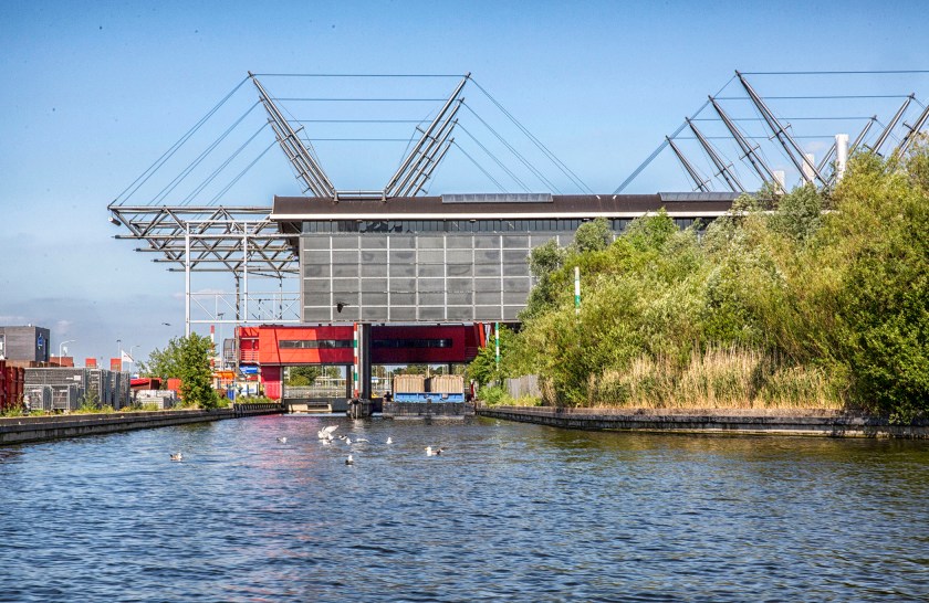 Als vrijwillig schipper bij De Willemsvaart zie ik ook andere kanten van Den Haag. Dit is het afvaloverslagstation op de Binckhorst. Als je dit gebouw vanaf de Plutostraat of de Meteoorstraat ziet liggen, ziet het er altijd wat somber, misschien zelfs wat dreigend uit. Dat komt omdat je dan tegen het licht in kijkt. Het gebouw is dan eigenlijk niet meer dan een schaduwzijde. Van deze kant af met de zon mee is het heel wat vrolijker, vooral ook omdat er wat begroeiing om het opslagterrein heen staat en door de rode kantoortjes.