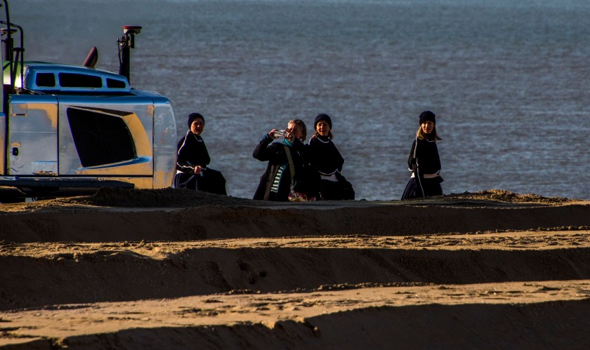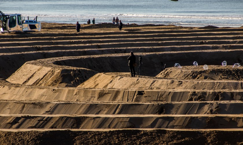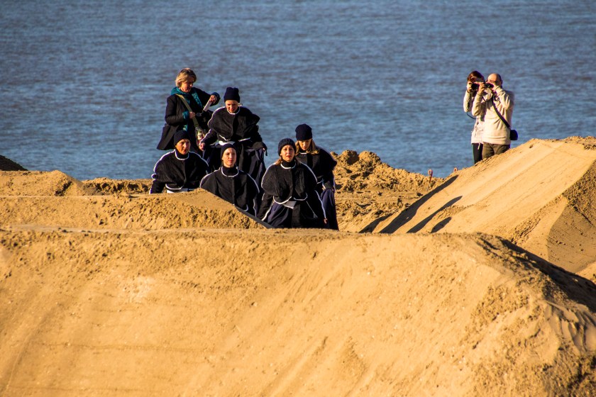 En beginnen met performen , oftewel een beetje met zand te spelen. Ontertussen staat er al enige tijd een meiske met een lelijke kartonnen doos lelijk in het zicht van de fotograaf. Later wordt wat duidelijker wat zijn daar doet. Aan het koor worden folie warmhoud dekentjes uitgedeeld met het verzoek de gouden kant buiten te vouwen en ze dan om te doen en aan de toeschouwers wordt verzocht de zilveren kant buiten te vouwen. Zo krijg je een soort kleurrijk geheel. Het koor humt en de performers bewegen in stilte en de toeschouwers fladderen bijna weg in de toch zwakke wind.