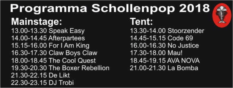 Je ziet de flyers en aanplakbiljetten van Schollenpop wel maar vergeet dan dat het nog moet komen. Aanstaande zaterdag 25 augustus 2018 is het weer zover. Dan treden vanaf 13.00 uur de volgende groepen op.