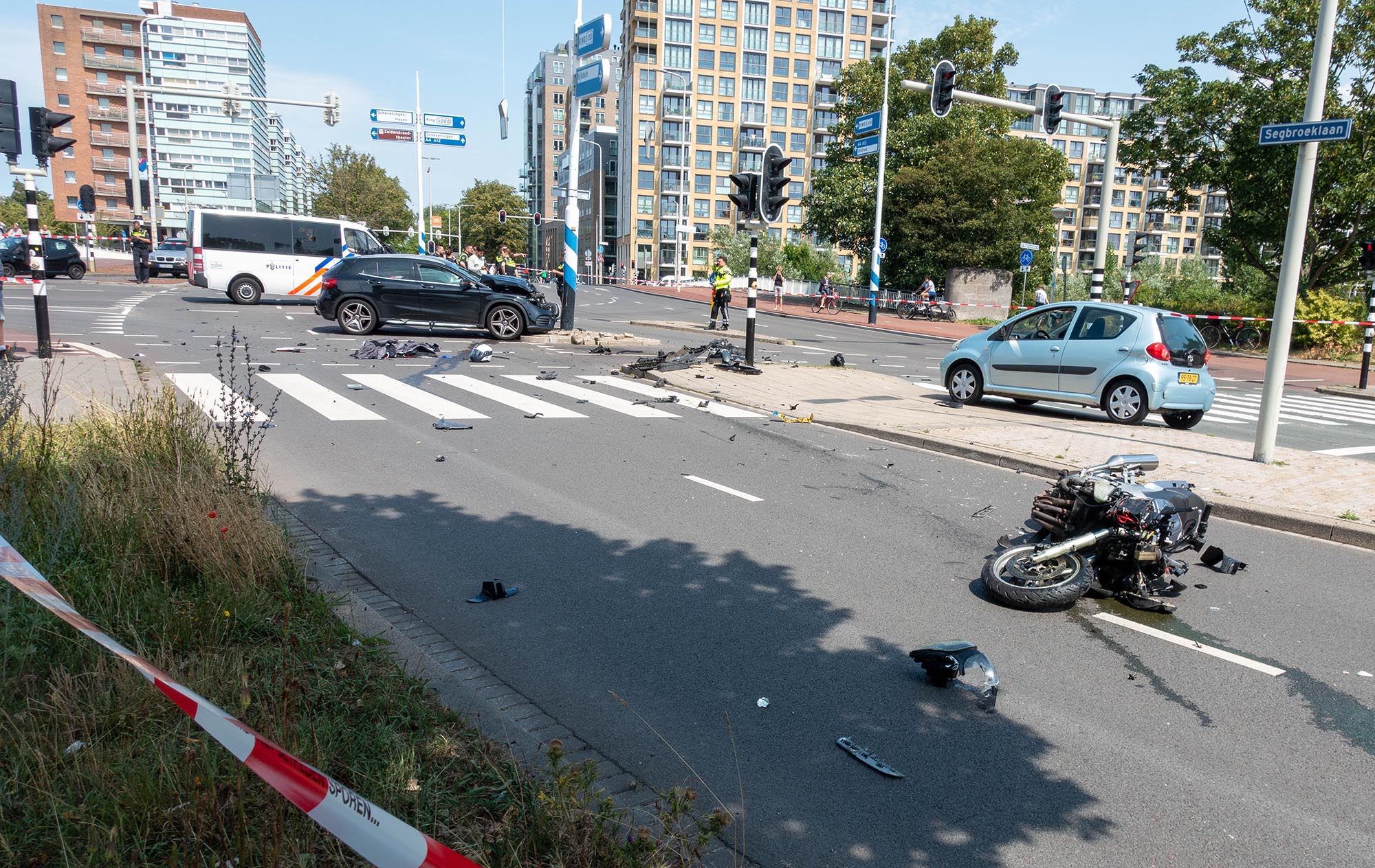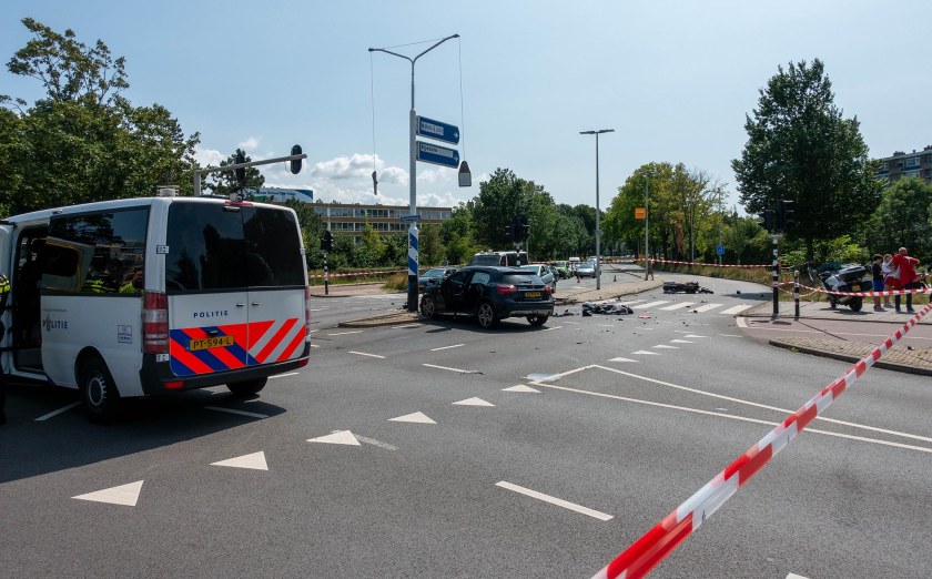 Ik fietste vanmiddag langs de Houtrustbrug en het kruispunt van de Segbroeklaan en de Houtrustweg. Daar stonden diverse politie auto’s, was een groot gebied met rood/wit lint afgezet en stond een enorm aantal politiemannen en -vrouwen toe te kijken en een aantal omstanders te interviewen. Even verder stond een Mercedes met verfrommelde voorkant tegen een grote lichtmast aan en iets verder lag een zware moterfiets op zijn kant. Gedeeltelijk ontmanteld. Voor de auto lag het rekje met helmtas van de motorfiets. Achter de auto diverse brokstukken van de auto en van de motor. Een jack lag op straat evenals een motorhelm. Een schoen stond er eenzaam te wezen. Duidelijk had hier de motor een grote klap tegen de auto gemaakt. Van welke kant was mij niet geheel duidelijk. Mogelijk kwam de motor van de Kennedylaan over de Houtrustbrug en knalde hij bij het kruispunt tegen de auto die van de Houtrustweg uit koers geraakt moet zijn en tegen de lantarenpaal aanreed. Mijn eerste gedachte was “cokesnuiver”. Ik werd eerder vanmiddag door eenzelfde ook zwart mercedes ingehaald op de Laan van Meerdervoort die daar met zeker 80 km/uur mij inhaalde en voor mij een fietser die overstak bijna aanreed en wegtoeterde. Ik verdenk deze Mercedes van te hard rijden en stoplicht jumpen. Ook de motor zal niet zacht gereden hebben. Het lijkt er haast op dat hij een grote buiteling heeft gemaakt over de voorkant van de auto. De technische mensen zullen dat misschien precies uitvogelen. De motorrijder was kennelijk al afgevoerd door een ambulance. Ik hoop voor hem dat hij nog leeft.