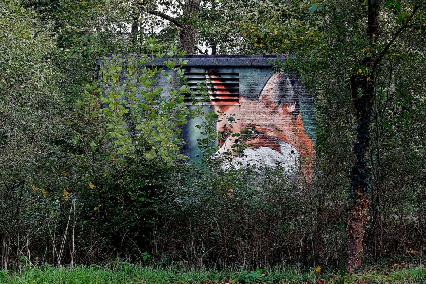 Anderhalve week geleden wandelde ik vanaf tramhalte Madurodam verder naar Scheveningen. Vanaf het Noorderstrand wat bunkers gefotografeerd en door het dorp wandelend liep ik naar tramhalte Frankenslag.Terwijl ik wat rondkeek zag ik op het transformatorhuisje een mooie mural van een vos tussen het gebladerte van het Scheveningse bos.Thuis even opgezocht wie de maker was, het blijkt psy-2ht murals and design te zijn die ik wel een heb ontmoet via onze vriend/graffiti kenner Akbar.
