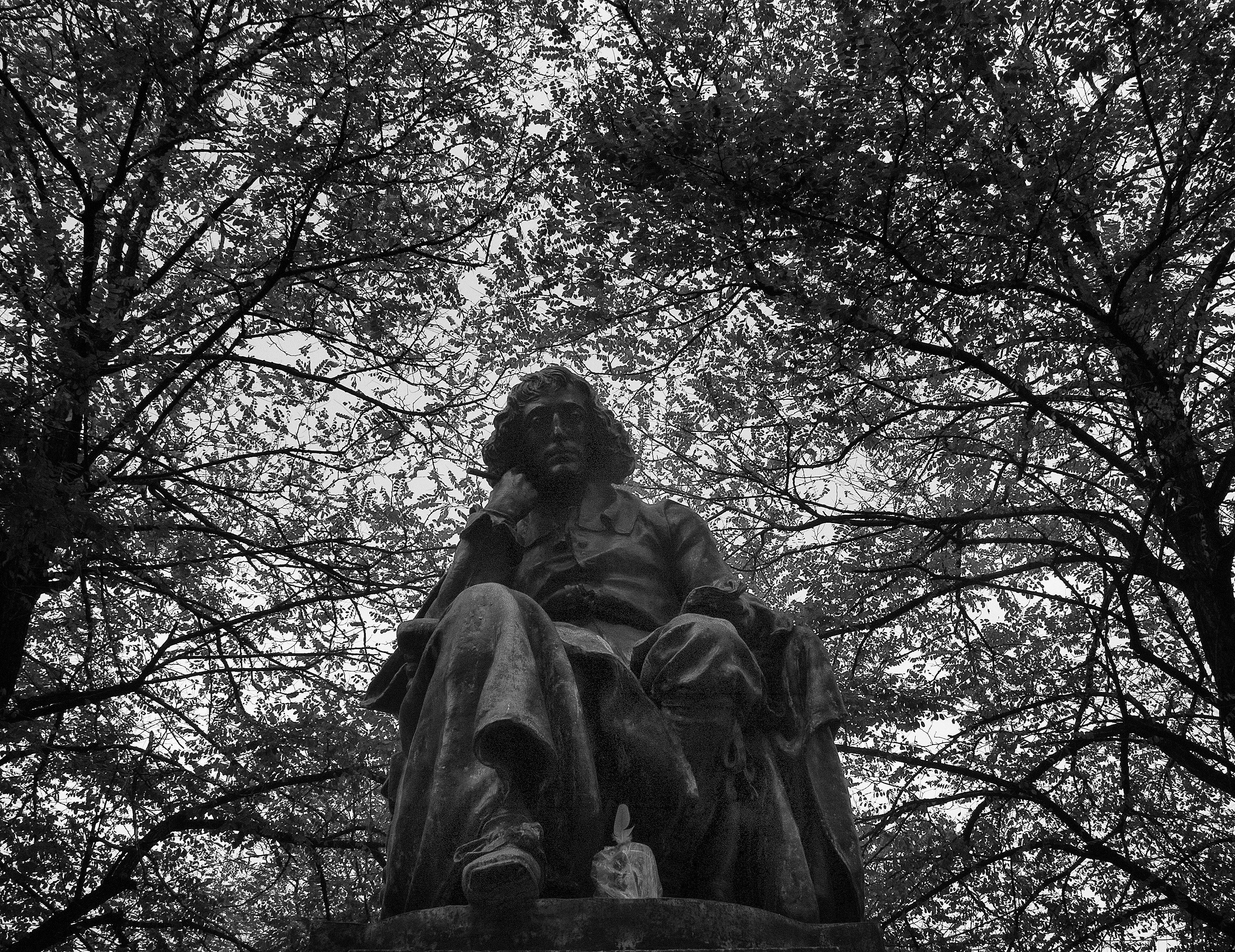 “Wee de voorbijganger die iets kwetsends zegt tegen deze vriendelijke en in gedachten verzonken figuur. Hij zal gestraft worden zoals alle vulgaire mensen gestraft worden door hun eigen vulgariteit en hun onmacht om goddelijke dingen te verstaan. Vanaf zijn granieten voetstuk leert hij ons over de manieren het geluk te bereiken die hij vond; en in de komende eeuwen zullen cultureel gevormde mensen die voorbij komen langs de Paviljoengracht tot zichzelf zeggen: “hier was het wellicht dat God het meest van dichtbij is gezien.”