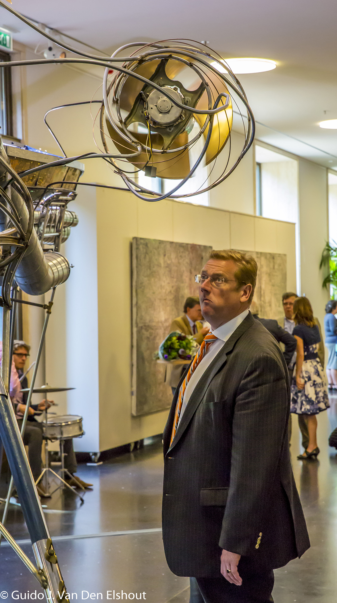 Deze foto’s maakte ik tijdens de opening van een kleine moderne kunst expositie in de lobby van zijn ministerie op 16 juni 2015, toen er nog geen sprake was van de latere opspraak. Dergelijke exposities worden daar wel meer georganiseerd. Van der Steur was er niet bij toen de openingstoespraakjes werden gehouden. Hij kwam later even zogenaamd “incognito” een kijkje nemen en verdween weer snel. Ik vond dat eigenlijk een beetje vreemde vetoning: Hij was in feite de gastheer van het tentoonstellinkje, hoe klein en onbelangrijk ook, Neem even een half uurtje de tijd om de honneurs waar te nemen en je personeel en de kunstenaars en de curator een hart onder de riem te steken in plaats van quasi geïnteresseerd te gaan staren naar de UFO die er tentoon gesteld is….of laat helemaal je gezicht niet zien, omdat je belangrijker zaken te doen hebt.