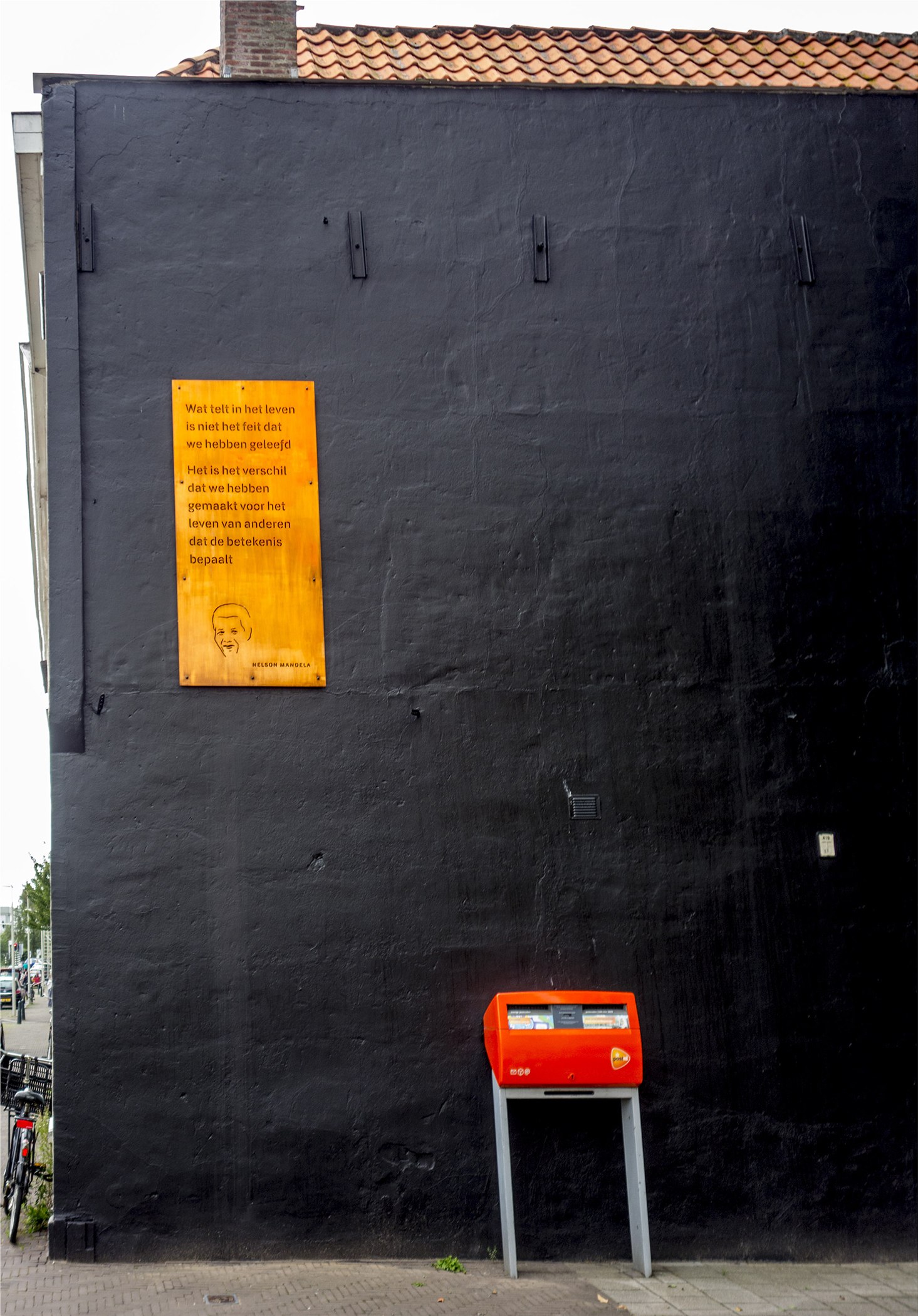 Ze hopen nog meer quotes op gevels te kunnen plaatsen. Ik vind dat oranje met die scheve oranjerode brievenbus op dat zwart wel fraai.