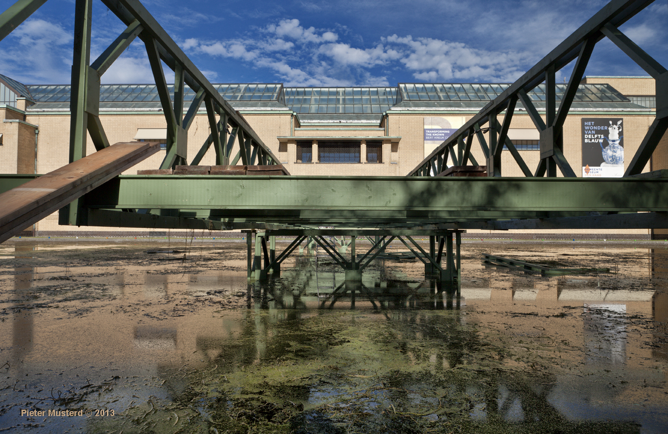 Harold de Bree (Voorschoten 1966) maakt in zijn werk veel gebruik van industriële vormen, vaak ook militair van oorsprong. De vijver voor het Gemeentemuseum is de ideale locatie, het verfijnde Berlage gebouw vormt een prachtig contrast met de ruwe materialen van de brug.