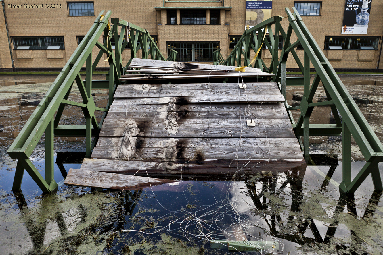 Dat brand ook al een vorm van kunst is komt vanavond goed tot uiting in de performance boven de museumvijver voor het Gemeentemuseum. Tijdens de uitvoering op zaterdag 14 september 2013 is deze Baileybrug als onmisbaar militair instrument in naam der kunst veranderd in een zwartgeblakerd karkas.