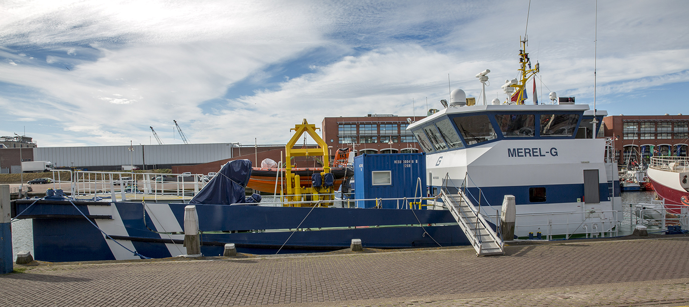 Er wordt gesleuteld aan de boot. Achterop staan een rek dat kennelijk diverse apparaten door het water kan slepen. Op het achterdek liggen vleugelachtige apparaten waarop staat Fish Finders. Niet alleen geodetisch, maar ook visstand kunnen ze kennelijk onderzoeken.