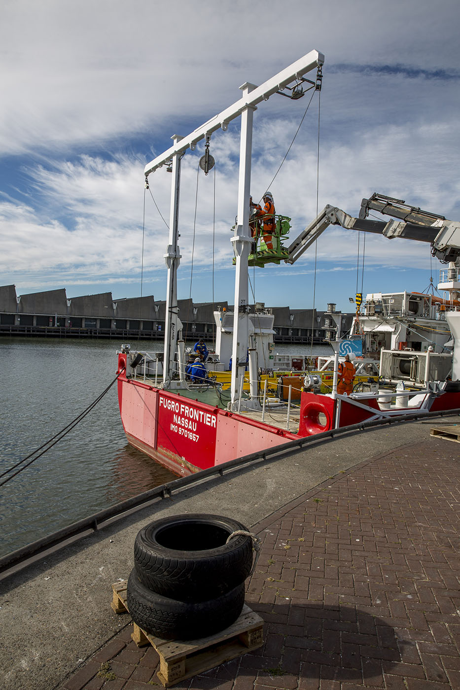 En dan fiets je langs de pijp waar ze aan de overkant met een zo te zien afzichtelijk gebouw voor het nieuwe Nationaal Zeilcentrum bezig zijn en kom je op het hoekje van de 1e binnenhaven de Fugro Frontier tegen, Die ligt met de kont naar je toe dus je kan onmiddellijk zien in welke tropische staat dit schip dat toebehoort aan het in Leidschendam gevestigde Ingenieursbureau annex seismisch onderzoekbureau annex offshore service bureau Fugro, staat geregistreerd: Nassau, Bahamas….Ja hoor. Toe maar. Kan allemaal.