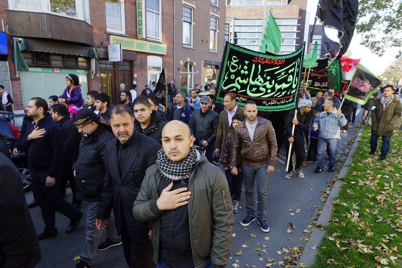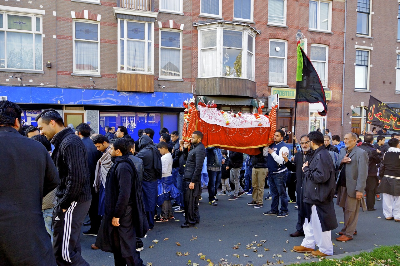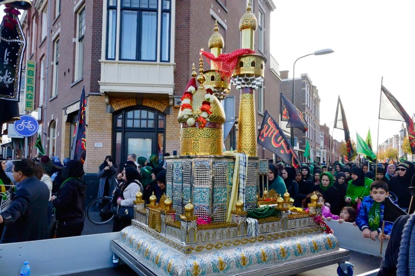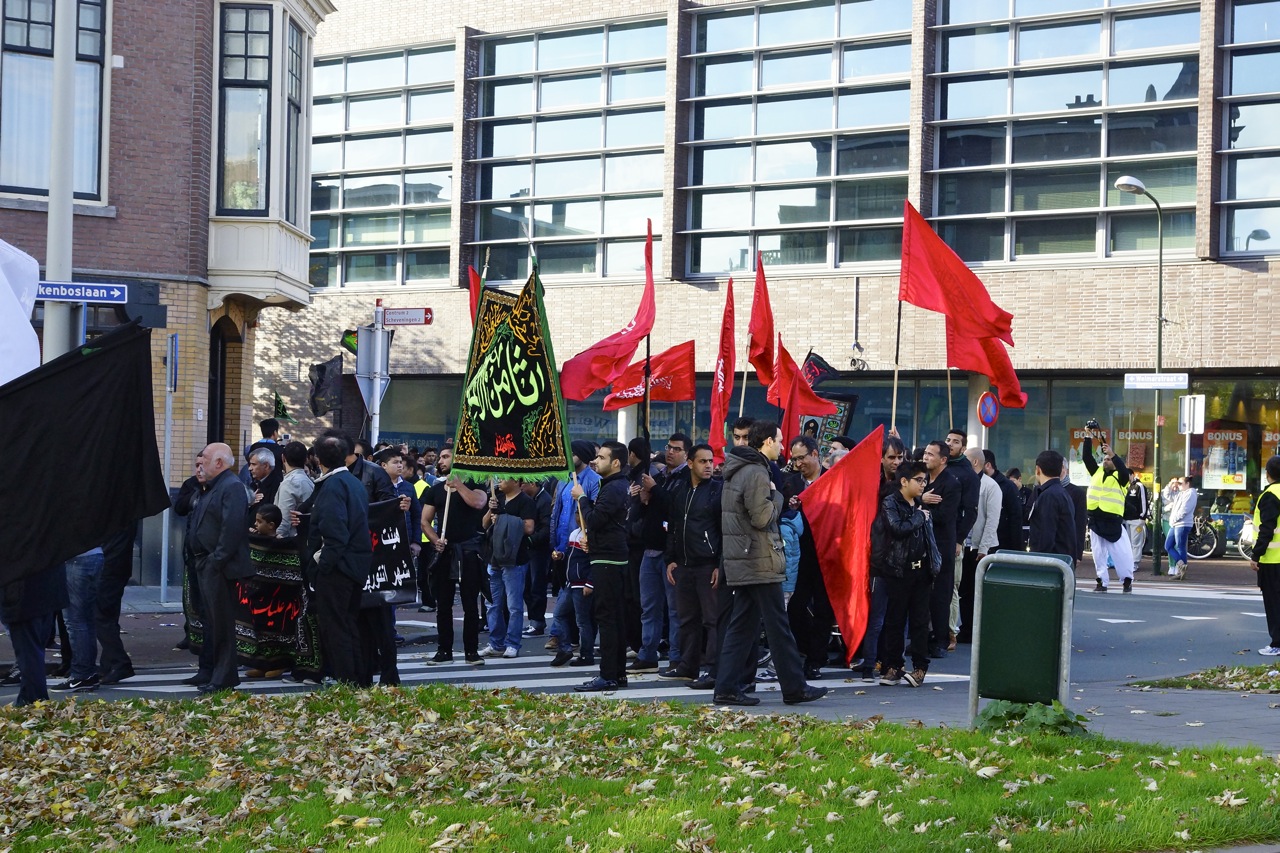 Enige duizenden moslims, vanuit diverse landen, liepen vanmiddag mee in de herdenkingsoptocht van Hussein. Foto: Roel Wijnants.