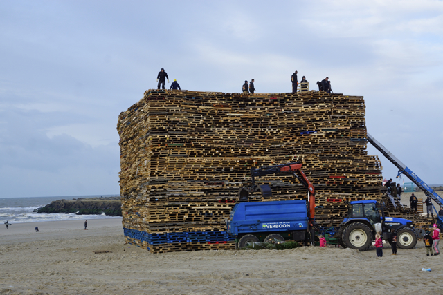 Traditiegetrouw bouwen Duindorpers elk jaar voor oudejaarsavond een grote stapel van pallets die op oudejaarsdag om middernacht als de fik er ingaat voor het grootste Haagse vuur ooit gaat zorgen .