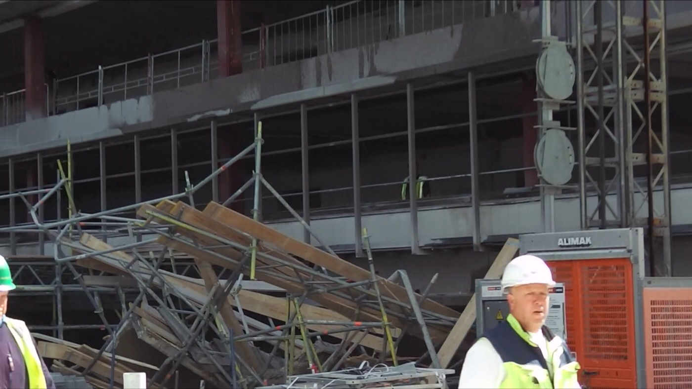 Het ziet er naar uit dat een tijdelijk bouwplateau inclusief steigerdelen van de negende etage is losgeraakt en in zijn val een onderliggend plateau heeft meegenomen.