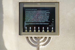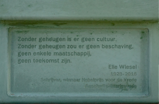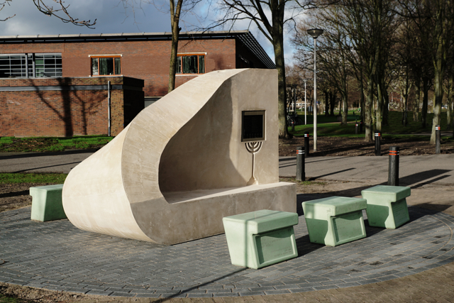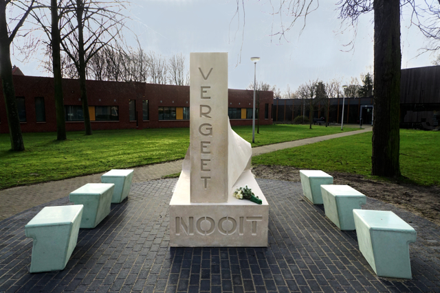 Het monument vormt een tijdlijn, verbeeld als een lange, dubbelgevouwen plak die een kwartslag is gedraaid. Deze vorm geeft uitdrukking aan de wens de tijd terug te kunnen draaien en zo de verschrikkelijke gebeurtenissen in de oorlogsjaren ongedaan te maken. Op de kopse kanten van de sculptuur prijken prominent de woorden ‘Vergeet’ en ‘Nooit’. In de flank zijn de jaartallen 1940-1945 zichtbaar. In het monument is ook een menorah, een Joodse kandelaar verwerkt. Direct daarboven is een touchscreen waar een permanente video te zien is van zeven brandende kaarsen, die na het opbranden worden vernieuwd, tevens is er de lijst met namen van de slachtoffers te raadplegen.